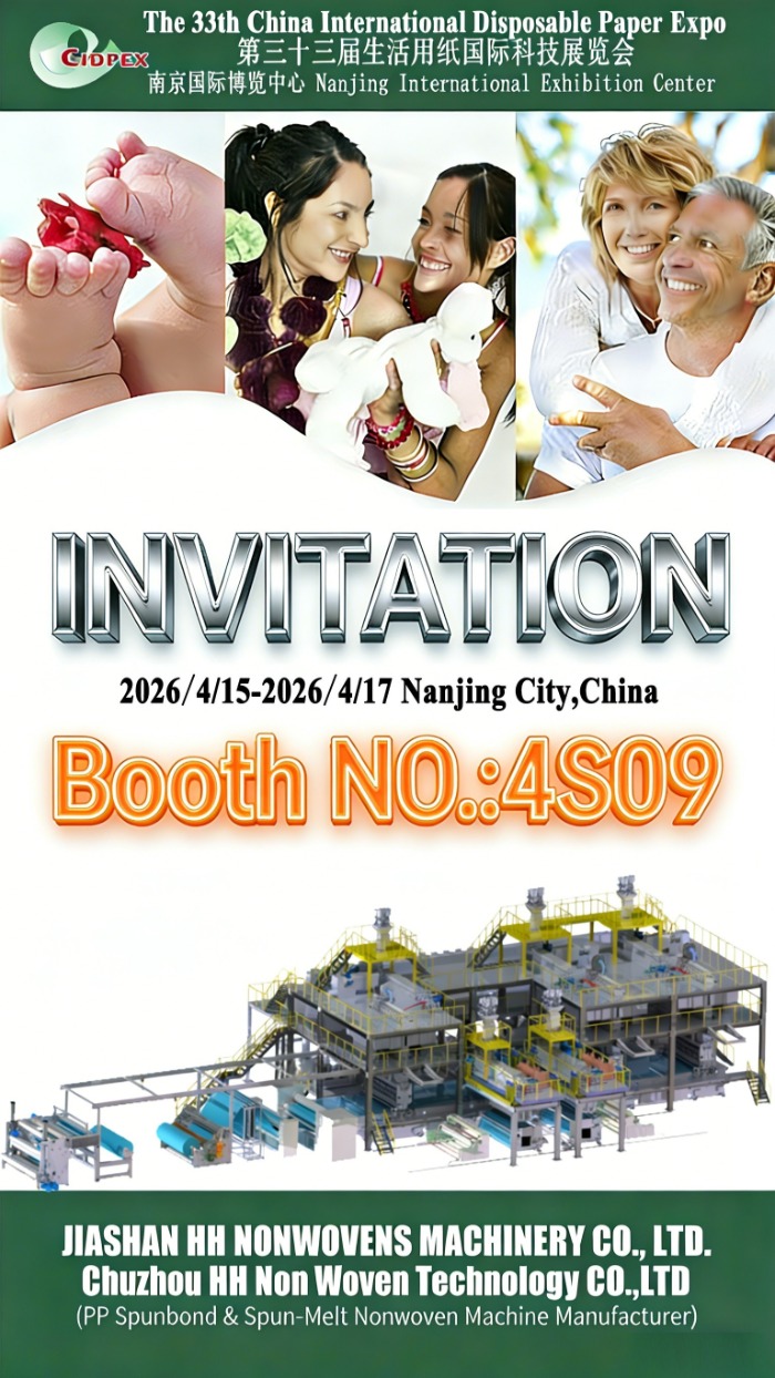 JIASHAN HH Nonwoven Makineleri CO., LTD. ve Chuzhou HH Non Woven Technology CO., LTD, fuara katılımımızı duyurmaktan gurur duyuyor 33. Çin Uluslararası Tek Kullanımlık Kağıt Fuarı (CIDPEX 2026) dan itibaren gerçekleşecek 15 - 17 Nisan 2026 , Nanjing Uluslararası Sergi Merkezi, Nanjing Şehri, Çin'de.